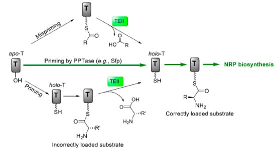 - Schwarzer, D.; Mootz, H.D.; Linne, U.; Marahiel, M.A. Regeneration of misprimed nonribosomal peptide synthetases by type II thioesterases. Proc. Natl. Acad. Sci. USA 2002, 99, 14083–14088. [Google Scholar] [CrossRef]