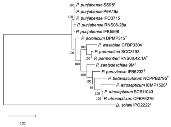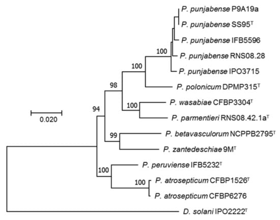 Multi-locus sequence analysis of P. punjabense strains and the most closely related species of the genus Pectobacterium. Maximum likelihood tree built with 14 housekeeping genes (acnA, fusA, gapA, glyA, groEL, gyrB, mdh, mtlD, purA, recA, rplB, rpoD, rpoS, secY) using MEGA X []. D. solani IPO2222 (CP015137) was used as an outgroup. Bootstrap values were calculated from 1000 replicates.