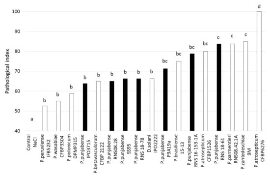The P. punjabense strains varied in their tuber maceration capacity (Figure 4). For strains IPO3715, RNS08-28, SS95T and RNS18-78, the pathological index was significantly lower than that of RNS 18-61, which had an index similar to that of the reference strain P. zantedeschiae 9MT, previously described as a strain with a high maceration capacity []. Strains P9A19a and RNS16-153-1a presented a pathological index of 71 and 79, respectively, indicating an intermediate aggressiveness level compared to the other strains of the panel. Finally, none of the P. punjabense strains tested showed a potential maceration capacity equivalent to the referent aggressive strain P. atrosepticum CFBP6276 under the conditions of the experiment.
