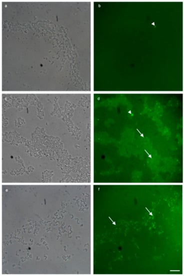 Multi-probe FISH successfully detected plasmid bound vanA fluorescein (green) resistance genes in enterococcal biofilm. (a,b) 100× micrograph overlays of a negative biological control using MF04010 and fluorescein probes targeted to the vanA vancomycin resistance gene. (a) Phase contrast imaging to highlight MF04010, 48-h biofilm cells grown with TSB (1% glucose) at 37 °C incubated statically. Media was replaced at the 24-h time point. (b) Green fluorescent imaging of the same region. (c,d) 100× micrograph overlays of the addition of sub inhibitory (10 µg/mL) vancomycin for 34 h, to the vanA positive MF06036 in a 24-h pre-established biofilm grown with TSB (1% glucose) at 37 °C. (c) Phase contrast imaging MF06036 vancomycin exposed biofilm. (d) Green fluorescent imaging of the same region. (e,f) 100× micrograph overlays of the addition of sub inhibitory (10 µg/mL) vancomycin to the biofilm formation media TSB (1% glucose) during the formation of isolate MF06036′s biofilm (24 h). Media was replaced at the 24-h time point with vancomycin TSB (1% glucose) for an additional 24 h. (e) Phase contrast imaging MF06036 vancomycin exposed biofilm. (f) Green fluorescent imaging of the same region. Scale bar represents ten microns. Arrowhead—fluorescence artefact, arrow—cell positive for vanA staining.