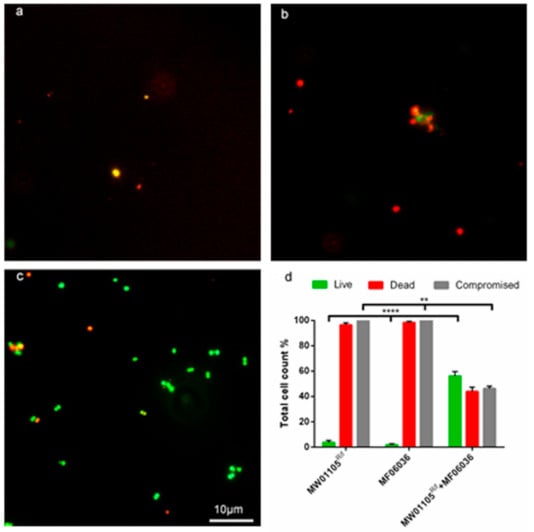Application of double antibiotic selection and lysozyme degradation permitted the successful selection of transconjugants inside 24-h biofilms. (a) 100× micrograph of a biofilm made with MW01105Rif. (b) 100× micrograph of a biofilm made with MF06036. (c) 100× micrograph of a conjugation reaction with MW01105Rif and MF06036 inside biofilm. Subfigures (a–c) were visualised with live/dead BacLight staining (green/red) after treatment with double selection (10 µg/mL vancomycin, 100 µg/mL rifampicin) to inhibit/kill cells. The biofilm was then treated with lysozyme (2 mg/mL) for a further 24 h to eradicate the compromised cells. (d) A graph showing the total cell count of the three biofilms visualised in (a–c). Error bars represent the standard error of the mean of each cell count group for MW01105Rif, MF06036 and MW01105Rif + MF06036. Experiments were carried out with six biological repeats and five independent repeats. Statistics generated from each repeat used 10 regions of interest. Scale bar represents ten microns. Significance **** p = 0.0001, significance ** p = 0.002.