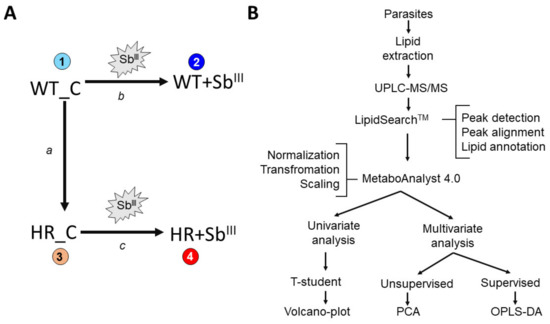 Schematic representation of the experimental design. (A) Four experimental conditions were evaluated (1–4), each one with three independent biological replicates. Experimental condition 1: Wild type strain control (WT_C), without SbIII pressure. Experimental condition 2: wild type strain growing under SbIII pressure (WT+SbIII). Experimental condition 3: antimony highly resistant strain control (HR_C), without SbIII pressure. Experimental condition 4: antimony highly resistant strain growing under SbIII pressure (HR+SbIII). Three dual comparisons for differential lipid expression were performed (a–c). (a) Basal changes in drug resistant strain in the absence of drug, by the comparison of resistant strain HR_C versus sensitive WT_C in the absence of SbIII drug. (b) Sensitive strain responding to SbIII by the comparison of WT+SbIII versus WT_C. (c) Highly resistant strain responding to SbIII by the comparison of HR+SbIII versus HR_C. (B) Summarized workflow for lipidomic analysis from lipid extraction to statistical analysis including the integration of the LipidSearchTM (Thermo Scientific) and metaboanalysit 4.0 software. Volcano plots were used for the differential lipid expression analysis at the univariate method while principal component analysis (PCA) and Orthogonal partial least squares discriminant analysis (OPLS-DA) for multivariate approach.