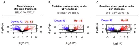 Volcano plots display significant differences at the lipid expression level in antimony resistant parasites. The volcano plots show the statistical significance (p value) transformed by the negative base 10 logarithm in the Y-axis versus the fold change (FC) transformed by the binary logarithmic function in the X-axis. The data from three biological repeats were analyzed. Statistically significant changes in lipids were detected in the antimony resistant strain under basal conditions in the absence of drug (A), in the antimony resistant strain responding to SbIII (B), and in the antimony sensitive strain responding to SbIII (C). The differentially expressed lipid ions were filtered by the p-value cutoff ≤ 0.05 and the absolute fold change cutoff ≥ 2. Significantly downregulated and upregulated lipid ions are highlighted with blue and red dots respectively while lipids with no significant changes are showed in black dots.