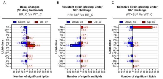 Phosphatidylcholines (PC) and triglycerides (TG) are the main lipid classes differentiating antimony resistant Leishmania phenotypes. All lipid classes detected are represented in the Y-axis and the number of lipids differentially expressed are represented in the X-axis. The data from three biological repeats were analyzed. The group of down regulated or up regulated lipids is highlighted in blue and red bars, respectively. The average fold changes are shown in front of each bar, and negative and positive values indicate if the lipids were detected to be decreases or increases, respectively. (A) Basal antimony resistant phenotype changes. (B) Resistant strain responding to SbIII. (C) Sensitive strain responding to SbIII. Duplicate signals coming from different adducts, multiple fragmentation or software lipid identification were filtered. Enriched lipid class with the highest number of differentially expressed lipids are highlighted with yellow star.