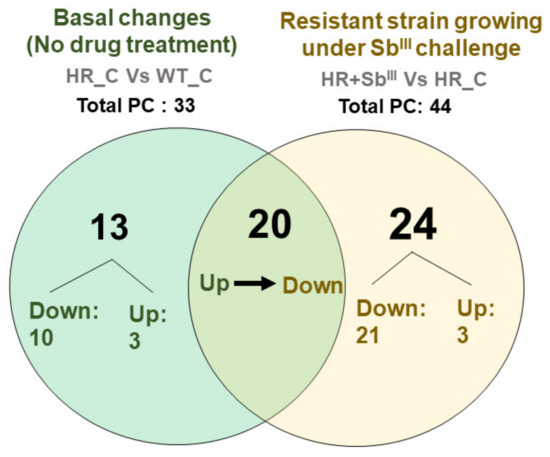 Phosphatidylcholine (PC) decrease is associated with the antimony resistant profile. The distribution of differentially expressed PCs is represented in a Venn diagram. Both the downregulated or upregulated PCs are plotted by two different comparisons: basal phenotypic changes in resistant strain in the absence of drug (green circle) and resistant strain responding to SbIII (yellow circle). Total values correspond to total PC detected as significantly differentially expressed.