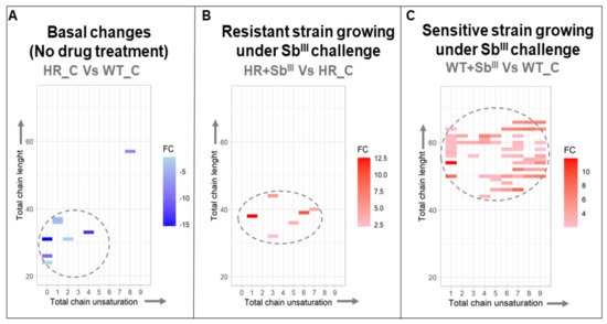 The upregulation of triglycerides with long-chain fatty acids is correlated with the antimony sensitive phenotype. The data from three biological repeats were analyzed. The charts represent the log 2-fold change of differentially expressed triglycerides (gradient color bar), distributed by the total chain lengths (Y-axis) and total unsaturation levels of fatty acids contained in triglycerides (X-axis). (A) Basal antimony resistant phenotype changes. (B) Resistant strain responding to SbIII. (C) Sensitive strain responding to SbIII. The downregulated and upregulated triglycerides (TGs) are represented by blue and red cells, respectively. Dotted lines highlight the main distribution of TGs per comparison.