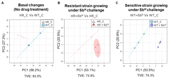 Unsupervised multivariate analysis showing a clear sample grouping per class. The PCA score plots are represented by individual comparison. The data from three biological repeats were analyzed. (A) PCA score plot of the basal antimony resistant phenotype changes explaining 83.5% of the total variance. (B) PCA score plot of the resistant strain responding to SbIII, explaining 73.6% of the total variance. (C) PCA score plot of the sensitive strain responding to SbIII, explaining 74.3% of the total variance. Each individual marker represents a biological replicate. Total variance explained (TVE) in summarized. The 95% confidence ellipse using Hotelling T-squared is represented.