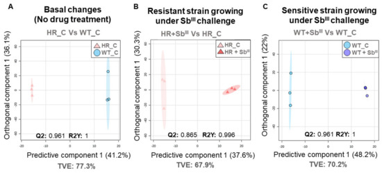 Supervised multivariate analysis indicating a clear inter-class discrimination. The score plot from Orthogonal partial least squares discriminant analysis (OPLS-DA) are represented by individual comparison. The data from three biological repeats were analyzed. (A) OPLS-DA score plot for the basal antimony resistant phenotype changes. (B) OPLS-DA score plot for the resistant strain responding to SbIII. (C) OPLS-DA score plot for the sensitive strain responding to SbIII. All models were successfully validated by one thousand permutations getting optimal Q2 and R2Y scores without any evidence of overfitting. Each individual marker represents a biological replicate. Total variance explained (TVE) in summarized. The 95% confidence ellipse using Hotelling T-squared is represented.