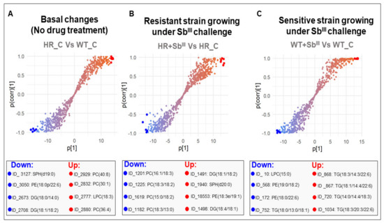 S-plots from the OPLS-DA models, for the detection of potential biomarkers. The S-plot is a scatter plot of the p[1] (magnitude effect) vs p(corr)[1] (reliability) vectors of the predictive component. (A) S-plot for the basal antimony resistant phenotype changes. (B) S-plot for the resistant strain responding to SbIII. (C) S-plot for the sensitive strain responding to SbIII. The lipids with higher reliability and magnitude effect across the group discrimination are highlighted at the S-plot tails. The top four of both downregulated and upregulated lipid ions are highlighted with blue and red dots respectively.