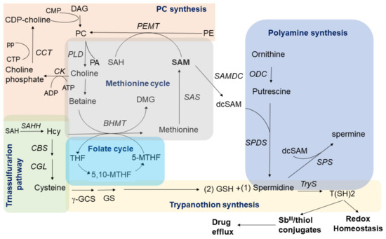 Phosphatidylcholine (PC) is a major cell membrane constituent and precursor of important second messengers. In Leishmania parasites, PC synthesis can occur via the CDP-choline pathway (Kennedy pathway), the N-methylation of phosphatidylethanolamine (PE), and by the remodeling of exogenous phospholipids [50]. Particularly, while choline is a potential source of methyl donors, PC biosynthesis via PE methylation requires S-adenosylmethionine (SAM), a universal methyl donor involved in several roles in protozoan parasites [51]. SAM can participate in several interconnected pathways such as the methionine cycle, the synthesis of polyamines (spermidine, spermine), and the trans-sulfuration branch of homocysteine metabolism forming trypanothione (two molecules of glutathione joined by spermidine) [52]. The activation of the trypanothione metabolism has been widely documented as a mechanism of antimony resistance contributing to combat the oxidative stress caused by the drug. Thiols can produce conjugates thiol-SbIII inhibiting the drug action, a process followed by the thiol-SbIII efflux via exocytosis [53].