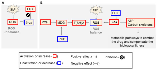 Model of antimony resistance in Leishmania parasites at the lipidomic level. (A) The antimony (SbIII) induces reactive oxygen species (ROS) production and β-oxidation (β-ox) inhibition, causing accumulation of triglycerides with more long chains fatty acids (LTG) and a poor energy metabolism. (B) To combat those alterations, resistant parasites rescue methyl donor groups (MDG) such as SAM and DMG. This strategy involves PC biosynthesis decrease (PCB) and/or the increase of PC hydrolysis (PCH). Higher MDGs levels improve the thiol (R-SH) metabolism and the downstream reaction of trypanothione T(SH)2 synthesis required to reach a ROS balance. The successful antioxidant response offers the opportunity for the controlled activation of pathways ROS generators, such as the β-ox. The β-ox can use the fatty acids from LTG to produce ATP and carbon skeleton, which are required to activate the metabolic pathways involved in both the drug control (drug sequestration, drug metabolism or drug efflux) and the biological fitness compensation.