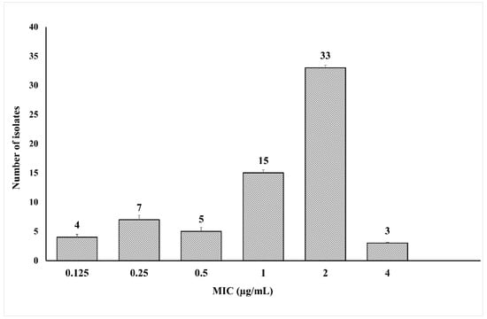 The susceptibility of 67 E. coli strains isolated from patients with UTIs to different antibiotics showed that 89.6% of these isolates possessed an MDR phenotype being resistant to ≥3 groups of antimicrobials. All the isolates were resistant to amoxicillin-clavulanate, third and fourth generation cephalosporins. High resistance rates, exceeding 50%, were detected for fluoroquinolones, sulfamethoxazole-trimethoprim and gentamicin. While 67.2% of the isolates were resistant to imipenem, meropenem retained its activity against most of the isolates with a percentage of susceptibility of 86.6%. Meropenem is listed as a precious antibiotic in Egyptian hospital settings and is not widely prescribed in out-patient clinics. The most frequently encountered MDR profile included resistance to amoxicillin-clavulanate, cephalosporins, fluoroquinolones and sulfamethoxazole-trimethoprim (Supplementary Table S1), a profile that correlates with the extensive usage of these antibiotics in Egyptian healthcare establishments as per the Infectious Diseases Society of America (IDSA) guidelines implemented in these facilities. The prevalence of the MDR phenotype among UPEC isolates has been recently reported in different governorates in Egypt. Gawad et al. [2] detected the MDR phenotype among 91% of UPEC isolates in two governorates in the northeastern part of Egypt. In the capital, Cairo, Abdelkhalik et al. [20] reported an MDR pattern in 80% of UPEC isolated from women with acute uncomplicated cystitis. In the present study, six isolates (8.9%) were resistant to colistin. Reports from the Upper Egypt sector revealed a colistin resistance of 32.7%, 20.8% and 23.1% among UPEC isolates in three different governorates [11,21]. After a preliminary screening using disk diffusion method, the MIC of colistin against the 67 tested isolates in the current study was determined by broth microdilution, the recommended method by CLSI 2020. The colistin MIC values ranged from 0.125 to 4 µg/mL with MIC50 and MIC90 reaching 2 µg/mL (Figure 1). Using the broth microdilution method, three isolates (4.5%), EC13049, EC14142 and EC13655, had MIC values = 4 µg/mL and were selected for further tests.