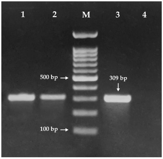 Agarose gel showing PCR amplification of mcr-1 gene in three E. coli strains isolated from urinary tract infections. Lane M: DNA molecular weight marker (100 bp ladder). Lanes 1, 2 and 3 show the amplicon (309 bp) of mcr-1 gene corresponding to EC13049, EC14142 and EC13655, respectively. Lane 4 exhibits the negative control (E. coli, ATCC 25922).