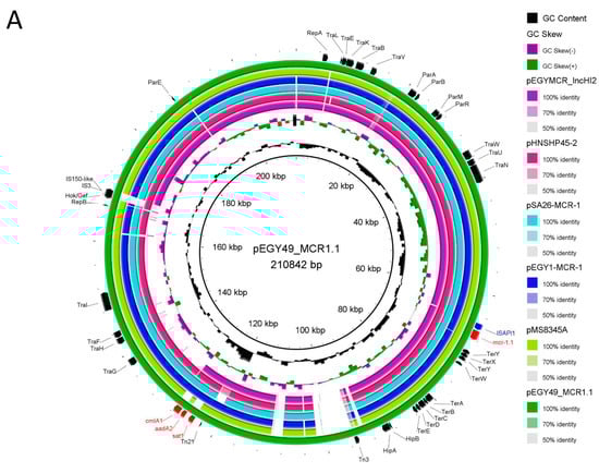 The mcr-1.1 gene was located on an IncHI2 plasmid which was 210,842 bp in length and had an average G + C content of 45.3%. This is consistent with previous findings indicating that the global spread of mcr-1 is mainly generated by three plasmid replicon types: IncI2, IncX4, and IncHI2 [8]. The plasmid designated pEGY49_MCR1.1 (accession number: MW719568) was shown to be a conjugative plasmid transferring the mcr-1.1 gene to the recipient E. coli K-12 and was subtyped as pST4. The pEGY49_MCR1.1 plasmid contained 236 CDSs (128 hypothetical proteins) and showed the conserved IncHI2 architecture comprising genes encoding proteins involved in conjugative transfer, replication, plasmid stabilization and maintenance. Furthermore, genes corresponding to Tn3 transposon and to the insertion sequence ISApI1 were located on the plasmid. pEGY49_MCR1.1 carried the tellurium resistance genes (terABCDE) usually associated with IncHI2 plasmids, in addition to terX, terY and terW [38]. Transposon Tn21 known to encode genes for heavy-metal resistance, namely mercuric compounds, was found as well on the plasmid [8]. BLASTn analysis of pEGY49_MCR1.1 with the available database showed that this plasmid shared high sequence identity (99.9% nucleotide identity, 93% sequence length) with the first reported IncHI2 mcr-1-positive plasmid pHNSHP45-2 (GenBank ID KU341381) identified in China [39]. In comparison with the two IncHI2 sequenced plasmids from Egypt, pEGY49_MCR1.1 showed 100% nucleotide identity (93% sequence length) to the IncHI2 pEGY1-MCR-1 (GenBank ID CP023143) plasmid identified in an E. coli strain isolated from a popular Egyptian raw milk cheese, karish cheese [24] and shared high similarity (99.9% nucleotide identity, 75% sequence length) to the mcr-1-positive IncHI2 plasmid pEGYMCR_IncHI2 (GenBank ID MT499884) identified in E. coli strain recovered from a chicken carcass in the Upper Egypt Sector [8]. The remarkable similarity of the mcr-1-carrying plasmid in E. coli identified from human sources in the current study to those recovered from different food origins in Egypt reflects the local epidemic nature of this IncHI2 plasmid that circulates among different sources and facilitates the dissemination of the mcr-1 gene from the food chain to humans. pEGY49_MCR1.1 shared a striking sequence similarity to two IncHI2 mcr-1-bearing plasmids from clinical source identified in the Middle East region, where it was totally identical to pMS8345A (100% nucleotide identity, 92% sequence length) recovered from E. coli isolated from a patient in Qatar (GenBank ID CP025402) [40], and was highly similar (99.9% nucleotide identity, 92% sequence length) to pSA26-MCR1 (GenBank ID KU743384) isolated from E. coli strain from a patient in Saudi Arabia [41]. This similarity points to the possibility of this plasmid being the key vehicle for the spread of the mcr-1 gene among E. coli from the Middle East region to North Africa, where Egypt is located. Additional genes were detected alongside mcr-1 and were associated with resistance to aminoglycosides (aadA2), streptothricin (sat1) and amphenicols (cmlA1) (Figure 3A). The co-existence of other antibiotic resistance genes on mcr-1-carrying plasmids presents the hazard of screening colistin-resistant strains under the imposed selective pressure exerted by antibiotics other than colistin [42].