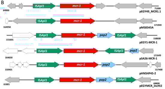 It has been hypothesized that in around 2006, an initial mobilization event of mcr-1 occurred via the development of the ISApl1-mcr-1-orf-ISApl1 composite transposon [43]. Following this event, the stabilization of mcr-1 into a wide range of plasmid types was reached by the loss of flanking ISApl1 elements over time and the subsequent mcr-1 spread through plasmid transfer to different bacterial species started. Although the mobilizing capability of the transposon is thought to be suppressed after the loss of both ISApl1 elements, the presence of a single copy is stated to be competent in partial translocation ability, with the upstream copy being more functionally efficient [44]. In silico analysis of the immediate proximity of mcr-1.1 in the detected IncHI2 plasmid confirmed that a single upstream copy of the ISApl1 insertion sequence was detected in pEGY49_MCR1.1 (Figure 3B). The absence of the complete composite transposon and the presence of the upstream copy of ISApl1 element suggest that the mcr-1.1 gene was transposed into the IncHI2 plasmid not long before isolation [32]. The flanking sequences of mcr-1 in pEGY49_MCR1.1 were highly similar (99.9% nucleotide identity, 81% query coverage) to those in plasmid pMS8345A (IncHI2; CP025402), both containing a single upstream copy of ISApl1 element in the direct vicinity of mcr-1. The genetic structures surrounding mcr-1 gene in pEGY1-MCR-1 (IncHI2; CP023143) and pEGYMCR_IncHI2 (IncHI2; MT499884) showed the presence of ISApl1-mcr-1-orf-ISApl1 differing from the genetic context of mcr-1 gene in the plasmid reported in this study, the latter lacking this composite transposon. In addition to the upstream copy of ISApl1 element in the flanking sequence of mcr-1 in pHNSHP45-2 (IncHI2; KU341381), a pap2-like phosphatase was found directly downstream of mcr-1 while pSA26-MCR1 (IncHI2; KU743384) exhibited a ISApl1-pap2-like phosphatase insertion downstream of mcr-1 gene (Figure 3B). Noteworthily, the comparison of the previously mentioned six genetic environments using BLASTn resulted in 99.9% identity with different query coverage.