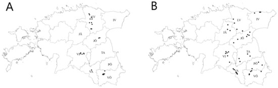 Map displaying sampling locations of the Zymoseptoria tritici population in Estonia in 2019 (A) and 2020 (B). Estonian counties are: IV—Ida-Viru; JÕ—Jõgeva; JÄ—Järva; LV—Lääne-Viru; PÕ—Põlva; TA—Tartu; VA—Valga; VI—Viljandi; VÕ—Võru.