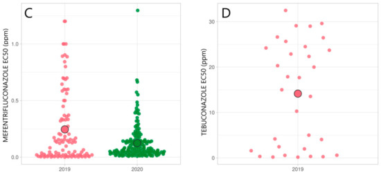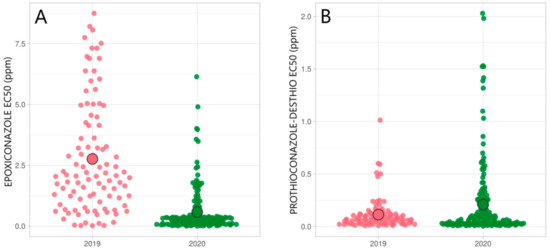 SuperPlotsOfData Shiny app was used for visualizing the EC50 results [38]. Statistical analyses were performed in GraphPad Prism (GraphPad Software, La Jolla, CA, United States) and StatPlus Pro 7.3.0.0 (AnalystSoft Inc., Walnut, CA, United States). Unpaired t-test with Welch’s correction was applied to compare the mean EC50 values from the Zt collected in 2019 and 2020 (α < 0.05). Pearson correlation analysis for log-transformed EC50 values for pairs of azole fungicides was performed.