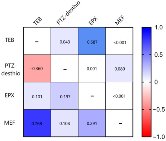 Correlation matrix between tebuconazole (TEB), prothioconazole-desthio (PTZ-desthio), epoxiconazole (EPX), and mefentrifluconacole (MEF) fungicide sensitivity in Estonian Zt population. Pearson correlation coefficient (r) values are below diagonal and p-values above diagonal.