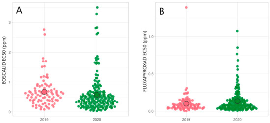 Table 5 summarizes the changes in EC50 values (ppm) and RF for boscalid and fluxapyroxad in different counties during the period 2019–2020. Sensitivity towards boscalid varied between counties, with average EC50 values ranging from 0.2 to 1.3 ppm in 2019 and from 0.34 to 0.84 ppm in 2020. At the same time, fluxapyroxad sensitivity was less variable between the counties than boscalid sensitivity. Average fluxapyroxad EC50 values ranged from 0.08 to 0.25 ppm in 2019 and from 0.08 to 0.23 ppm in 2020 in different counties.