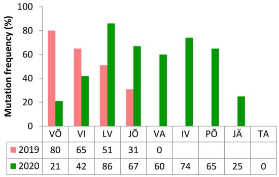 Mutation G143A frequencies in CytB gene by Estonian counties in 2019 and 2020. Counties are Võru (VÕ), Viljandi (VI), Lääne-Viru (LV), Jõgeva (JÕ), Valga (VA), Ida-Viru (IV), Põlva (PÕ), Järva (JÄ), Tartu (TA).