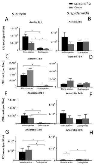 In this model, biofilms were grown without planktonic culture, which made this model more representative of native biofilms. Growing bacteria on filters is suitable for both staining and CFU counts because the filter itself is an abrasive material. The МTT staining results, indicating metabolic activity, were not significantly different in the biofilms. In general, we observed a significantly lower CFU count in S. epidermidis biofilms than in S. aureus in mono-species biofilms (1.5 ± 0.5 × 108 vs. 7.1 ± 1.5 × 108 after 24 h and 1.7 ± 0.5 × 108 vs. 1.4 ± 0.1 × 109 after 72 h under aerobic conditions, 1.4 ± 0.4 × 108 vs. 3.7 ± 1.2 × 108 after 24 h and 1.7 ± 0.2 × 106 vs. 2.3 ± 0.7 × 108 after 72 h under anaerobic conditions) indicating that S. aureus is more invasive without competitive strain. However, the CFU count of S. aureus was strongly decreased in dual-species biofilms (Figure 2A,C,E) by an order more than that of the mono-species biofilms (1.1 ± 0.1 × 107 vs. 7.1 ± 1.5 × 108 in the mono-species biofilms after 24 h, 7.1 ± 1.4 × 107 vs. 1.4 ± 0.1 × 109 after 72 h under aerobic conditions, 3.6 ± 0.9 × 107 vs. 3.7 ± 1.2 × 108 in the mono-species biofilms after 24 h, 4.5 ± 1.4 × 106 vs. 2.3 ± 0.7 × 108 after 72 h under anaerobic conditions), suggesting that S. epidermidis had an advantage and strongly suppressed the competitor. NE significantly increased this competitive growth suppression of S. aureus (2.7 ± 0.6 × 107 vs. 7.1 ± 1.4 × 107 in control) after 72 h of incubation under aerobic conditions (Figure 2C), but no effect was observed after 24 h. At the same time, the CFU count of S. epidermidis did not change significantly in dual-species biofilms, which is also evidence of the dominance of this skin commensal organism. In dual-species biofilms, the CFU count of S. aureus (1.1 ± 1 × 108 after 24 h and 7.1 ± 1.4 × 107 after 72 h) decreased under aerobic conditions over time, and NE enhanced this effect (9.5 ± 1.5 × 108 after 24 h and 2.7 ± 0.6 × 107 after 72 h). After 72 h of incubation in anaerobic conditions CFU count of S. epidermidis was increased in dual-species biofilms but NE increased this stimulation only in mono-species biofilms (Figure 2G).