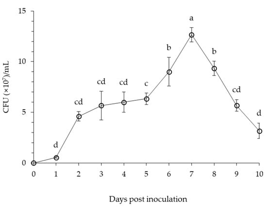 Cell growth curve of B. velezensis CE 100 in PB medium at 30 °C for 10 days. Error bars represent the standard deviation of three replications. Means with the same letter are not significantly different at p < 0.01 when compared using LSD test.