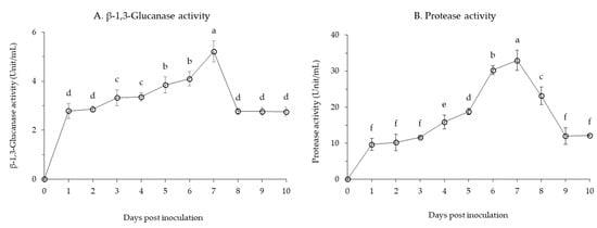 Changes in β-1,3-glucanase (A) and protease (B) activities in the culture supernatant of B. velezensis CE 100. Error bars represent the standard deviation of three replications. Means with the same letter are not significantly different at p < 0.01 when compared using LSD test.
