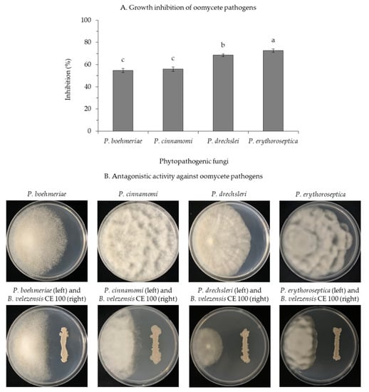 Inhibition effect of B. velezensis CE 100 on mycelial growth of P. boehmeriae, P. cinnamomi, P. drechsleri and P. erythoroseptica (A). Antagonistic activities of B. velezensis CE 100 against P. boehmeriae, P. cinnamomi, P. drechsleri and P. erythoroseptica (B) based on a dual culture method. Error bars represent the standard deviation of three replications. Means with the same letter are not significantly different at p < 0.01 when compared using LSD test.