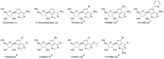 A range of tubercidin analogues (Figure 1) was synthetized as part of a campaign to find novel hits with enhanced selective potency against T. brucei compared to tubercidin [19,20,21]. Experimental details regarding their synthesis are described [19,20,21]. The synthesis of analogue 4 is described in Supplementary method S1. High activity to treat late-stage sleeping sickness was demonstrated for 3′-deoxytubercidin (2) [20]. Substitution of C-7 with a bromide, trifluoromethyl, or pyridin-2-yl group led to compounds 3–5, with the latter showing sub-micromolar activity in vitro [19]. Compounds 6–9 are 7-substituted 7-deazainosine analogues [21].