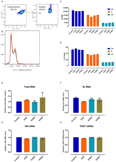 NY-SM cells were exposed to different concentrations of 5 (corresponding to the IC50, IC50/2, and IC50/5) for 24 h. For cell cycle analysis, the cells were harvested and washed with PBS before staining with 5 μg/mL Hoechst 33,342 for 25 min at 37 °C. Cells were analyzed on a MACSQuant flow cytometer (Miltenyi Biotec, Gladbach, Germany) using the FlowJo X software package. For RNA quantification, extracts were made from a normalized number of cells to correct for the impact of 5 on the number of recovered trypanosomes. RNA was extracted using the QIAamp RNA blood mini kit (QIAGEN, Hilden, Germany). Total RNA yields were determined using both Nanodrop 2000 spectrometry and Qubit fluorimetric RNA content analysis. Additionally, specific transcripts in the RNA pool were quantified using quantitative reverse transcription PCR (RT-qPCR) targeting the spliced-leader RNA (SL-RNA), 18S rRNA, and transcripts encoding the telomerase reverse transcriptase (TERT) (Table S1) [41,43].