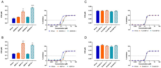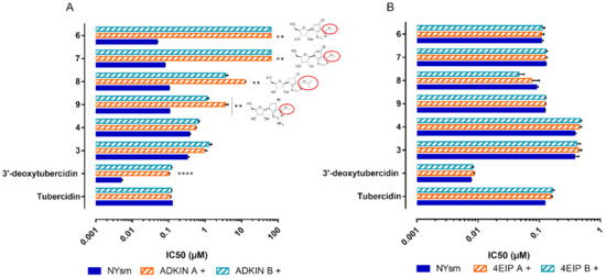 Susceptibility of ADKIN (A) and 4EIP (B). RNAi-mediated knockdown to compounds 1–4, and 6–9. Results are expressed as the mean IC50 (µM), and error bars represent SEM and are based on at least two independent experiments (n = 2), each with two biological replicates. + = tetracycline-induced clones. All experiments were performed with two independently generated RNAi clones. ** p < 0.01,**** p < 0.0001, Mann–Withney test comparing NY-SM with RNAi knock-down strains. ADKIN 3′-deoxytubercidin data was previously published [20].