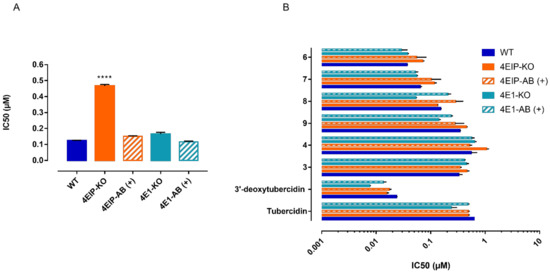 Susceptibility of 4EIP and 4E1 knockout cell lines to 5 (A) and compounds 1–4, and 6–9 (B). Results are expressed as the mean IC50 (µM), and error bars represent SEM and are based on at least two independent experiments (n = 2), each with two biological replicates. + = tetracycline-induced clones. **** p < 0.0001, Kruskal–Wallis test with Dunn’s multiple comparison test.
