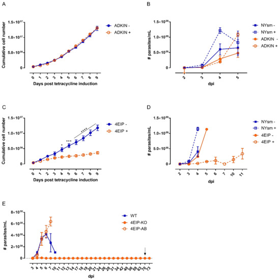 To evaluate the role of ADKIN and 4EIP, the impact of gene silencing on in vitro growth and in vivo infectivity were determined. Knockdown of ADKIN did not alter parasite growth in vitro and parasites retained a normal infectivity profile in mice (Figure 6A,B). In contrast, 4EIP RNAi parasites showed a significant growth deficit already evident after 24 h of tetracycline induction (Figure 6C). In mice, knockdown of 4EIP was responsible for a strikingly reduced infectivity (Figure 6D); however, the mice still succumbed to infection within 2 weeks, most likely due to a loss of the RNAi phenotype in vivo. This hypothesis was confirmed using 4EIP-KO parasites which could be detected during the first week of infection but were undetectable from day 7 onwards until the pre-set endpoint of 70 dpi (Figure 6E). Even after immunosuppressive treatment with 150 mg/kg cyclophosphamide, parasitaemia did not reappear confirming the essential nature of 4EIP for in vivo infectivity.