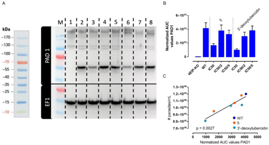 Western blot analysis for PAD1 expression. (A) PAD1 and EF1 protein expression (1: 4EIP-knockout, 2: untreated controls, 3–5: 5-treated with IC50, IC50/2 and IC50/5 and 6–8: 3′-deoxytubercidin-treated with the IC50, IC50/2 and IC50/5). (B) EF1-normalized area under the curve (AUC) values for PAD1. (C) Correlation between the normalized AUC values for PAD1 and culture density at time of collection.