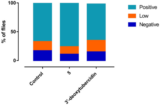 Impact of 5 supplementation on establishment of T. brucei in the tsetse fly midgut. Infectious blood meals were supplemented with 5 or 3′-deoxytubercidin at the IC50. Results represent the percentage of G. m. morsitans flies with a negative, low, or positive infection in the midgut and are a representation of two independent experiments with a minimum of 25 flies per group.