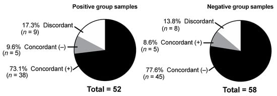 Excellent agreement between the four UATs was observed. In positive group samples, there was 82.7% concordance, where 73.1% of samples tested positive and 9.6% tested negative in all four UATs. For the negative group samples, the concordance rate was 86.2%. In total, 77.6% of samples tested negative, and 8.6% tested positive in all four assays. Overall, the four assays had discordant results in 17/110 (15.5%) samples (Figure 2).