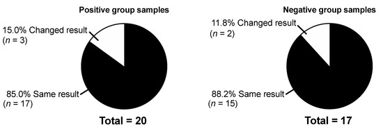 For performance analysis after long-time freezing, 37 samples (positive cases, n = 20; negative controls, n = 17) were randomly selected for re-testing with BinaxNOW, ImmuView, and STANDARD F after four months of storage at −80 °C. For 32 (86.5%) samples, the UATs showed the same result after storage, while for five (13.5%) samples, the results changed (Figure 3 and Table S3).