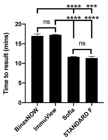 The mean time to result for BinaxNOW, ImmuView, Sofia, and STANDARD F were 17.0, 17.3, 11.7, and 11.3 min, respectively, with significant differences between immunochromatographic-based and immunofluorescent-based assays that could attributed to more steps required to set up a test, thus, more hands-on time (Figure 4).