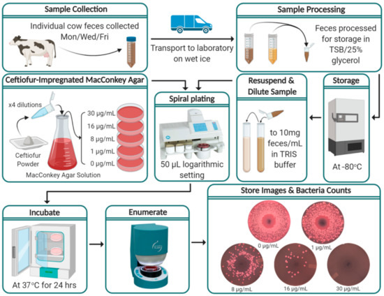 Figure 1 depicts the process from sample collection through to the enumeration of Enterobacteriaceae. Fecal samples were collected at enrollment (pre-calving) and three times a week onwards (every Monday, Wednesday and Friday) post-parturition until 60 DIM or until the cow was sold or died. Approximately 40 g of individual fecal samples were manually collected from the rectum of enrolled cows with disposable polyethylene sleeves, changed between each cow, with a small amount (<3 mL) of sterile lubricant applied. Feces were placed in individual, sterile, 50 mL polypropylene tubes, transported to the Veterinary Medicine Teaching and Research Center (VMTRC) on wet ice, and refrigerated at 4 °C until processing.