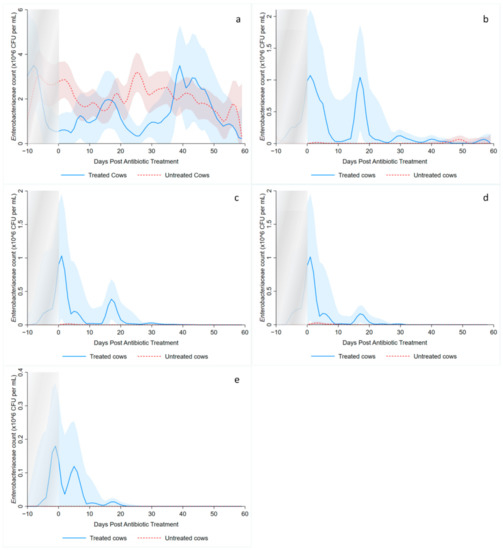 Kernel-weighted local polynomial smoothed regression plots for Enterobacteriaceae counts in cows treated with systemic antimicrobial drugs and time-matched untreated cows by days post-antibiotic treatment. Counts for ceftiofur resistance at (a) 0–1 µg/mL (b) ≥1 µg/mL (c) ≥8 g/mL (d) ≥16 µg/mL (e) ≥30 µg/mL. Shaded areas around the regression lines are the 95% confidence intervals. For treated cows, data between −10 to 0 days post-antibiotic treatment combine cows currently receiving treatment and pre-treatment cows, due to varying treatment duration (indicated by the shaded box).