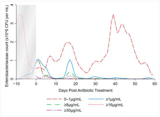 Kernel-weighted local polynomial smoothed regression plots for Enterobacteriaceae counts in cows treated with systemic antimicrobial drugs by days post-antibiotic treatment. Data between −10 to 0 days post-antibiotic treatment combine cows currently receiving treatment and pre-treatment cows, due to varying treatment durations (indicated by the shaded box).