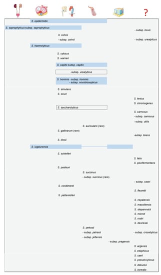 Overview of CoNS, according to the predominantly affected organ site or infectious syndrome, from left to right: urinary tract; cardiac valves; prosthetic joints and vascular grafts; bloodstream infections; skin and soft tissue infections; the question mark designates species of unknown clinical relevance. Most prevalent and relevant species are highlighted in blue; species are depicted in accordance with their first description, from top to bottom. Pictograms were taken with permission from Servier Medical Art [21].