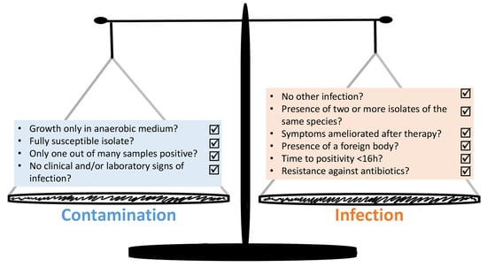 The group of CoNS is a heterogenous group constituted by a variety of different species, each with a unique set of traits. These microbiological properties have previously been described in detail [53]. Nevertheless, many studies have the tendency to compile all CoNS into one group. Not only do the phenotypic traits differ, but the niches which they tend to colonize vary widely. For example, S. capitis is found preferably on the scalp, while S. cohnii is isolated from feet, and S. saccharolyticus from back skin [40,54]. Considering the CoNS trait to colonize the human skin as commensals, it is not surprising that they can result in contaminated samples. Currently it remains a challenge to find valid and universally applicable tools that make it possible to decide whether the clinical case is an infection caused by CoNS or if the detection of a CoNS species indicates just a contamination with the same respective microorganism. Figure 2 summarizes a proposed set of criteria for the distinction between contamination and infection derived from the literature.