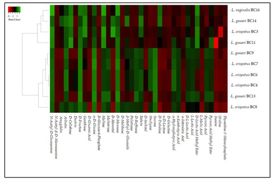 In order to show the metabolic differences among L. crispatus BC3, BC4, BC6, BC7, BC8, L. gasseri BC9, BC11, BC13, BC14, and L. vaginalis BC16, a heat map analysis was performed using the software found at http://www.heatmapper.ca/, accessed on 7 January 2021 [25]. The average linkage clustering specifying the distance between two clusters was computed as the average distance between objects from the first cluster and objects from the second cluster. All the experimental data are expressed as the mean value of six repetitions. The data were statistically analyzed by Statistica software (version 8.0; StatSoft, Tulsa, OK, USA) and subjected to the analysis of variance (ANOVA), and the test of mean comparison, according to Fisher’s least significant difference (LSD), was applied on all obtained data. The level of significance was p < 0.05.