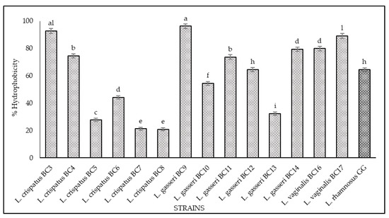 Cell hydrophobicity of L. crispatus BC3, BC4, BC5, BC6, BC7, BC8, L. gasseri BC9, BC10, BC11, BC12, BC13, BC14, L. vaginalis BC16, BC17, and L. rhamnosus GG ATCC® 53103™. The hydrophobicity percentage was calculated with the following formula: (A0 − At)/A0 × 100, A0 represents the absorbance at time 0 and At represents the absorbance at 560 nm after 1 h of incubation at 37 °C. Results are shown as average ± SD. Samples with different letters are significantly different (p < 0.05).