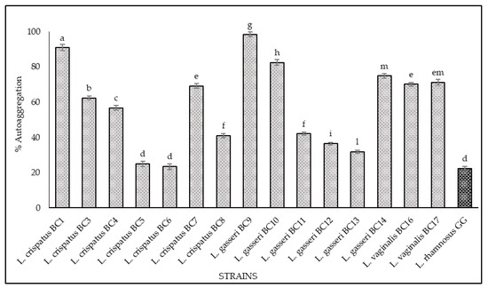 Cell auto-aggregation of L. crispatus BC1, BC3, BC4, BC5, BC6, BC7, BC8, L. gasseri BC9, BC10, BC11, BC12, BC13, BC14, L. vaginalis BC16, BC17, and L. rhamnosus GG ATCC® 53103™. The auto-aggregation was expressed as a percentage according to the formula: 1 − (At/A0) × 100, where At represents the average of absorbance values at time t = 1, 2, 3, 4, or 5 h and A0 the absorbance at t = 0. Samples with different letters are significantly different (p < 0.05).