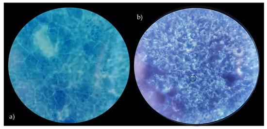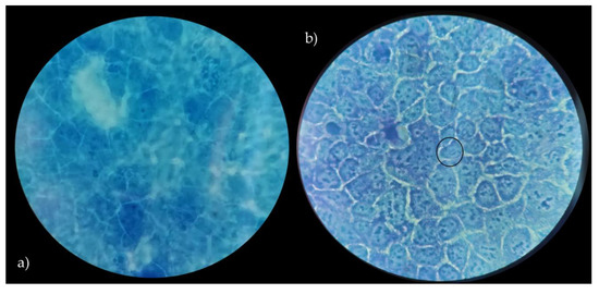 Caco-2 cells with no bacteria (a), adhesion of L. crispatus BC8 to Caco-2 cells (b). Images obtained under the optical microscope at 1000× magnification, in evidence the adherent bacteria.