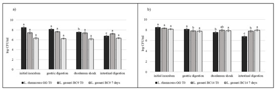 Cell loads of L. gasseri BC9 (a) and L. gasseri BC14 (b) after the simulated stomach–duodenum passage, immediately after the inoculation in milk (T0) and after 7 days of refrigerated storage, also compared with L. rhamnosus GG ATCC® 53103™. Results are shown as average ± SD. Samples with different letters are significant different (p < 0.05).