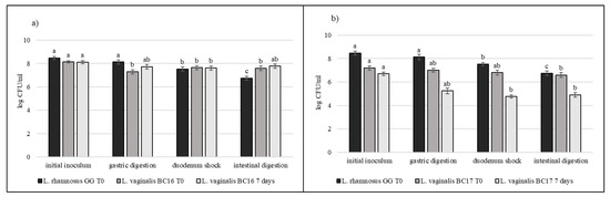 Cell loads of L. vaginalis BC16 (a) and L. vaginalis BC17 (b) after the simulated stomach–duodenum passage, immediately after the inoculation in milk (T0) and after 7 days of refrigerated storage, also compared with L. rhamnosus GG ATCC® 53103™. Results are shown as average ± SD. Samples with different letters are significant different (p < 0.05).