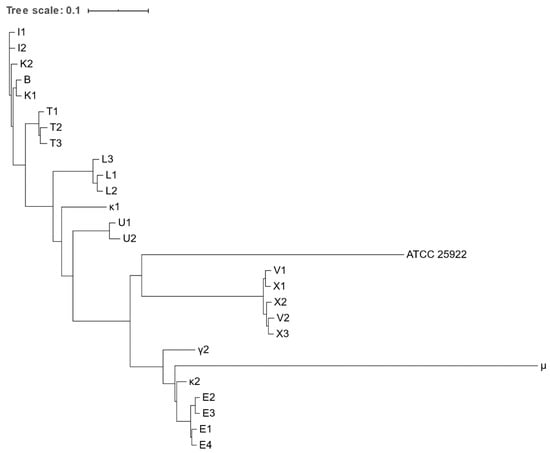 To determinate clonal dissemination of the Escherichia spp. isolates, single nucleotide polymorphisms (SNP)-based mapping analysis was performed using the CSI Phylogeny 1.4 tool with default parameters [] and with reference genome E. coli K-12 MG1655 (NC_000913.3) determined by the RefSeq NCBI Genome Database. The constructed tree was visualized using iTOL. In addition, multilocus sequence types were determined using the Pasteur (http://bigsdb.pasteur.fr, accessed: 28 August 2020) and Warwick [] institute schemes, as well as phylogroups [], serotypes [], FimH and FumC types [] and virotypes [].